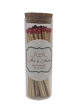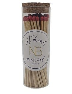 Stout apothecary-style glass jar with cork lid containing 48 natural 5″ wooden matchsticks — longer sticks than the 80-strike jar version. Striker friction surface on the backside of the jar. Comes in a printed gift box measuring 2-1/3″ x 2-1/3″ x 4″. Choice of 17 match tip colors; dyed matchstick colors available for an additional charge.